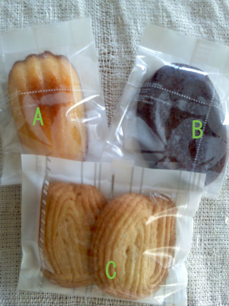 Bフィナンシェ:薄力粉・砂糖・卵白・アーモンドプードル・焦がしバターで、表面はサクサク中はしっとり